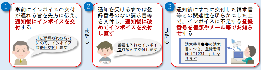 1.10月以降「インボイスの登録申請中です。10月1日が登録日となっています。登録番号が分かり次第、ウェブサイト(あるいは店舗のポスター、チラシなど)でお伝えします」というお知らせをレジやウェブサイトに貼っておく