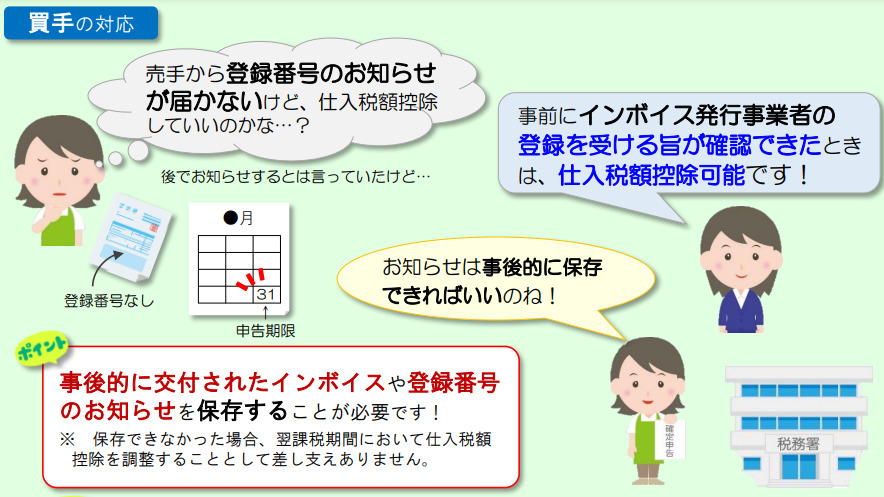 インボイスの発行事業者として登録することが確認できれば、仕入税額控除が可能です。登録の通知やインボイスの保管は事後でよいとされています。なお、通知が来たら、その通知とともに登録番号未記載の請求書や領収書を保管しましょう。