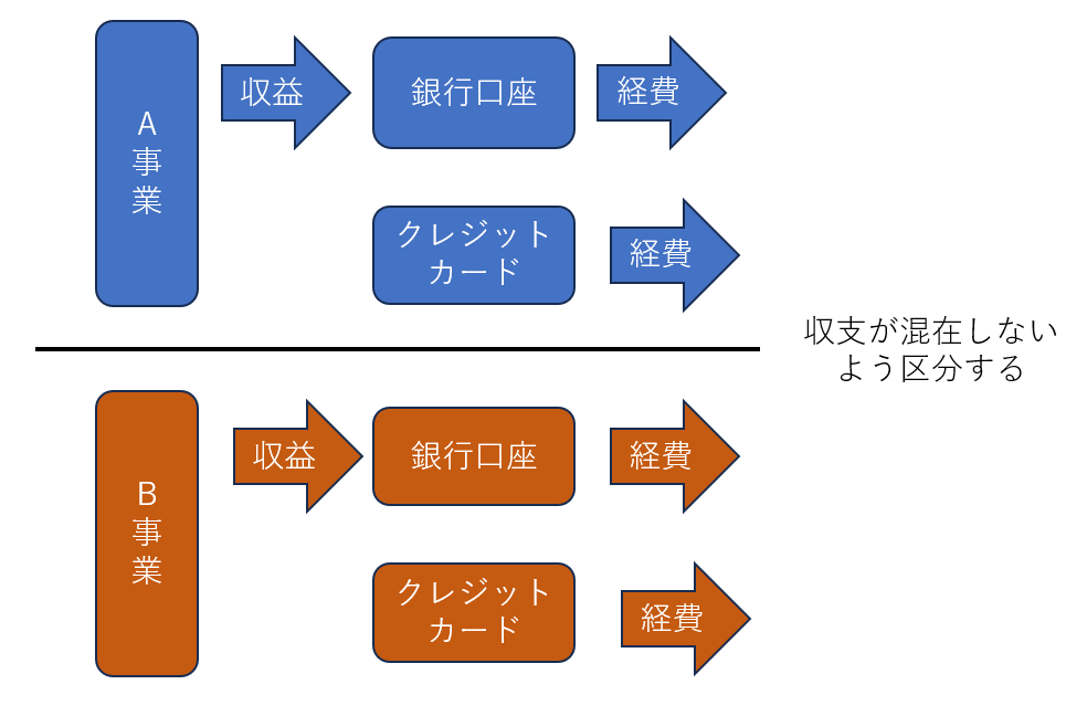 そのため、事業部門ごとに銀行口座を作成し、事業ごとの入出金をまとめることで部門別の管理がしやすくなります。可能であればクレジットカードも事業ごとに作成することで、経費管理がより分かりやすくなると思います。