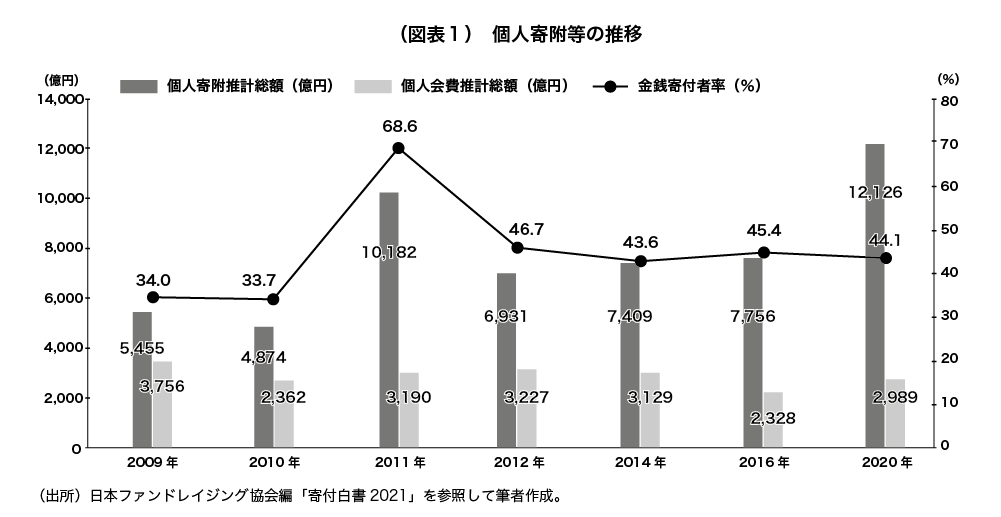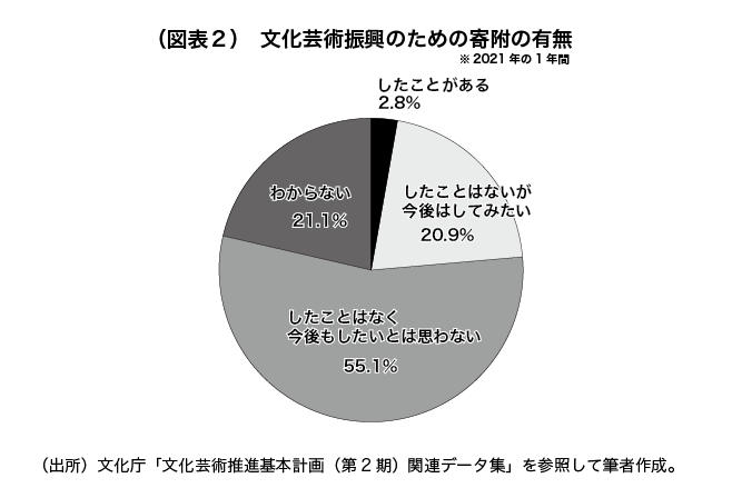 近年の個人寄附の総額は増加傾向にあります(図表1)。また、2021年の調査では、文化芸術振興のための寄附に関心のある層は調査数の2割(20.9%)を占めていました(図表2)。