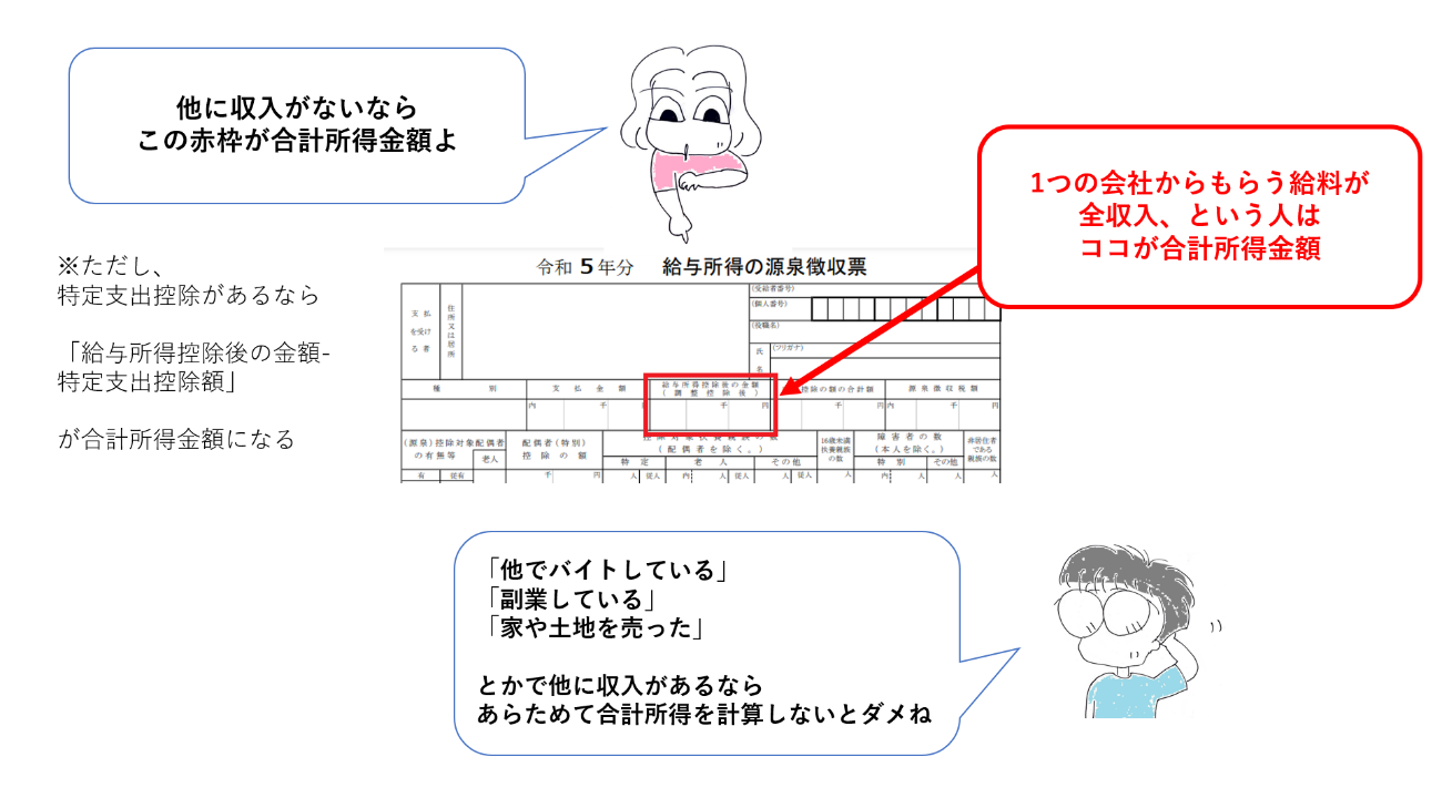 ま「給与を1か所しかもらってない人なら、源泉徴収票のココを見るといいよ」