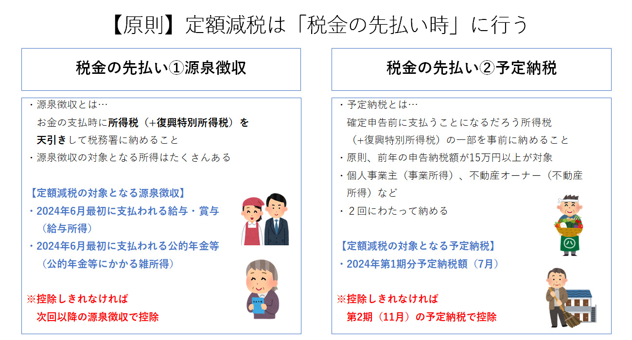 ま「1年間の所得税を年末調整や確定申告で総決算してるよね。でも実際、多くの人は事前に源泉徴収や予定納税という形で国に所得税を先払いしているのよ。その先払い税金で減税するってわけ」