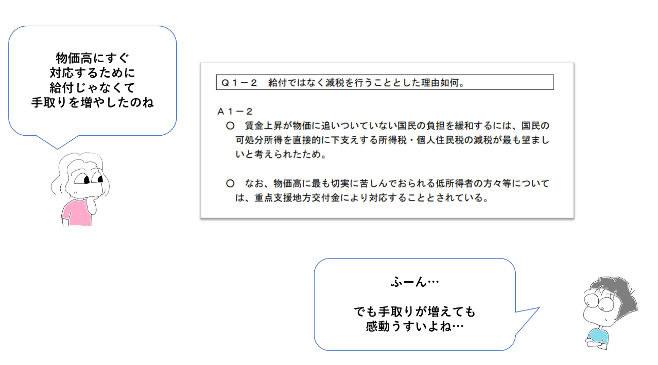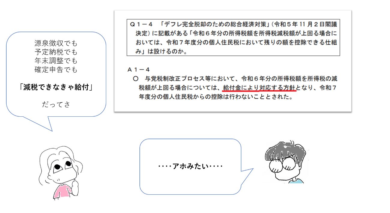 ま「2024年分の所得税で調整しきれなかったらそこで終わり。2025年分の所得税には一切影響させないようにするみたい。あと、住民税は2024年度分から減税するって。2024年6月分は徴収しないで、7月分以降、均等に減税していくみたいだよ」