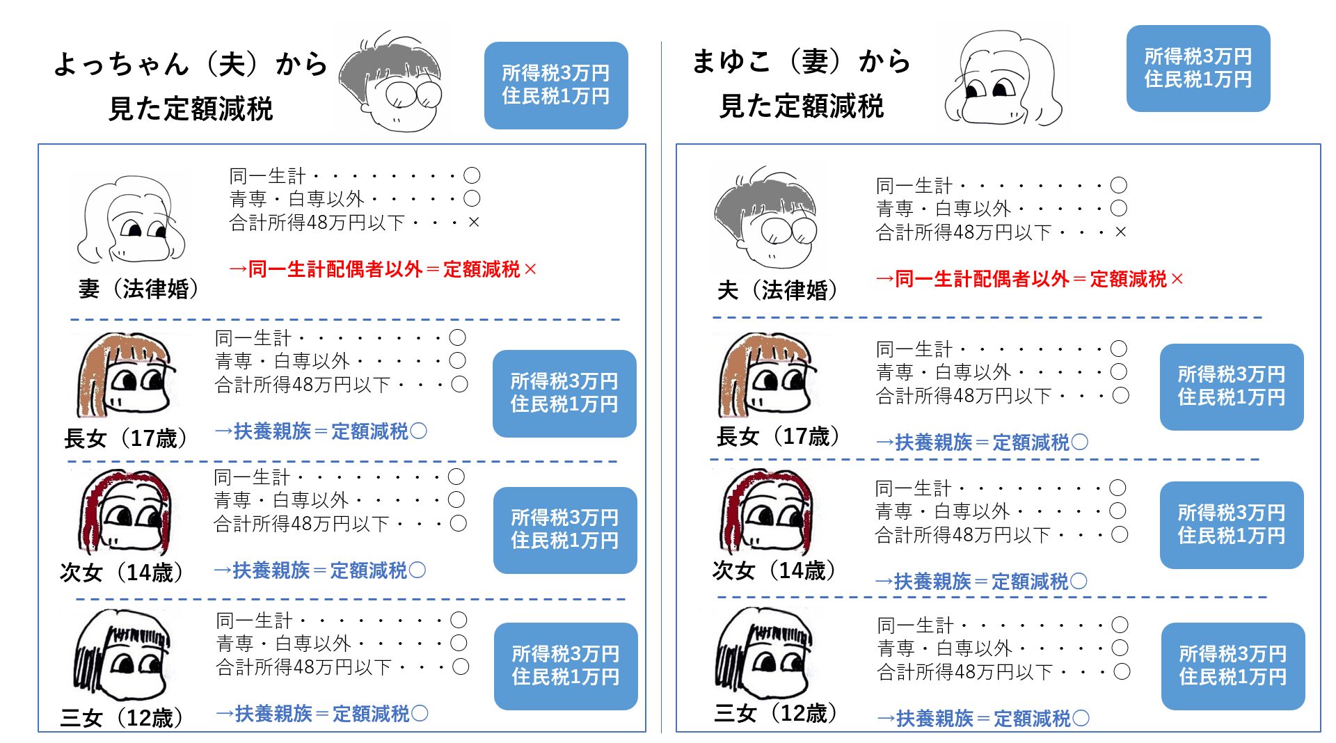 よ「俺かまゆ子のどちらかが『(所得税3万円+住民税1万円)×4人分=16万円』の控除を受けられるのね。めっちゃオトク」