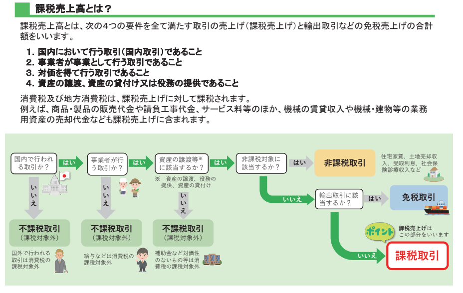自分が発行した請求書や領収書から2023年10月1日から12月31日までの課税売上高を計算します。なお、ここで集計すべき課税売上高は「消費税がかかる国内での取引」です。「居住用賃貸アパートの収入」「補助金、寄附金」は消費税がかかりません。
