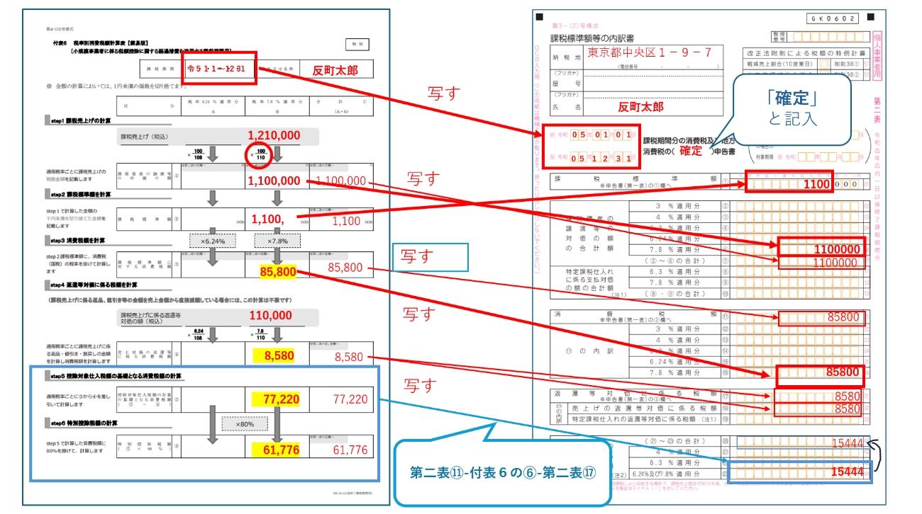 「→(矢印)を追うのが大変」と感じた方もいるでしょう。付表6の欄の中に、転記先が書かれています。これを見ながら書き写せば、だいたい何とかなります。