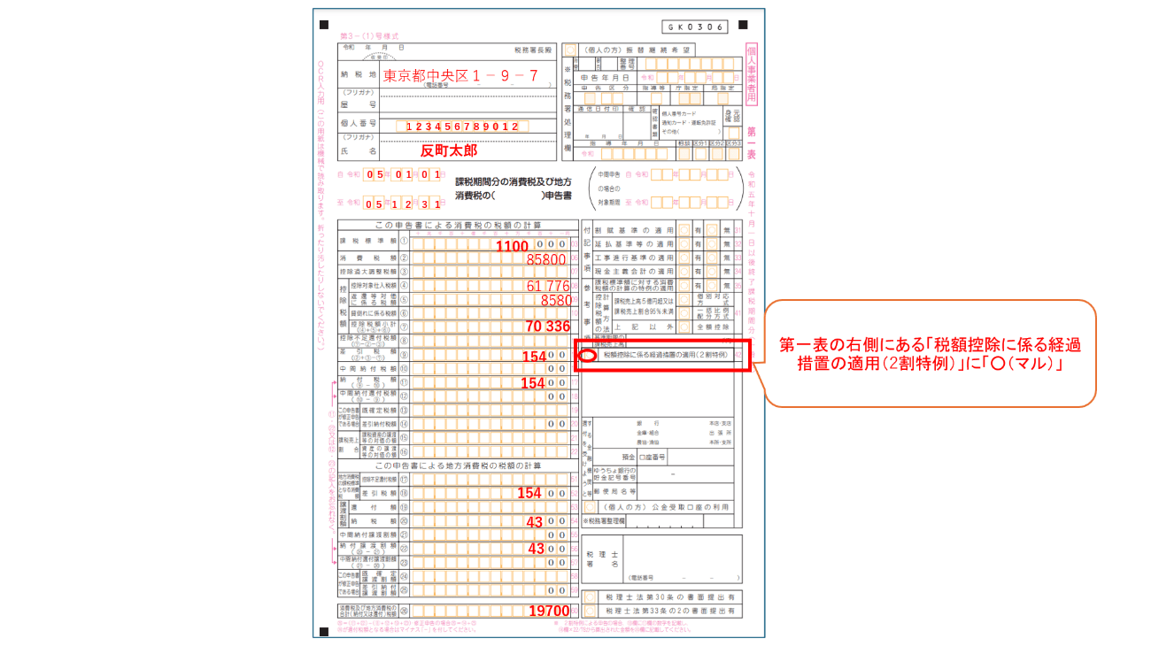 最後に、第一表の右側にある「税額控除に係る経過措置の適用(2割特例)」に「○(マル)」をします。