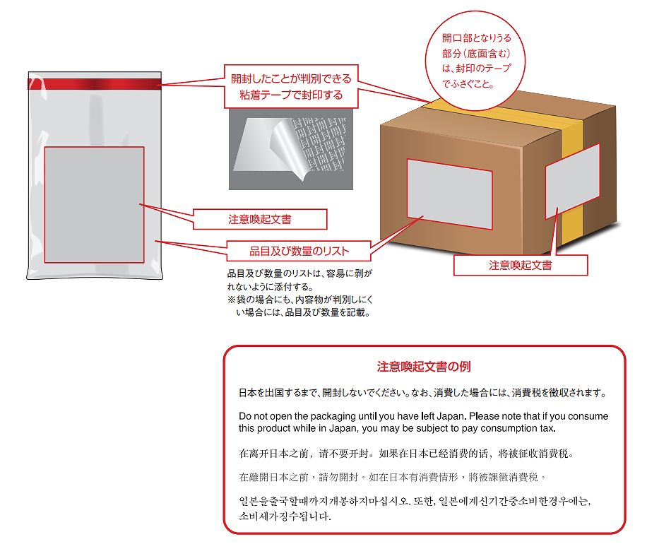 本邦から出国するまで開封してはならない旨及び消費税が免除された物品を消費した場合には消費税が徴収される旨が日本語及び外国語により記載されたもの又は記載された書面が貼り付けられたものであること。 |