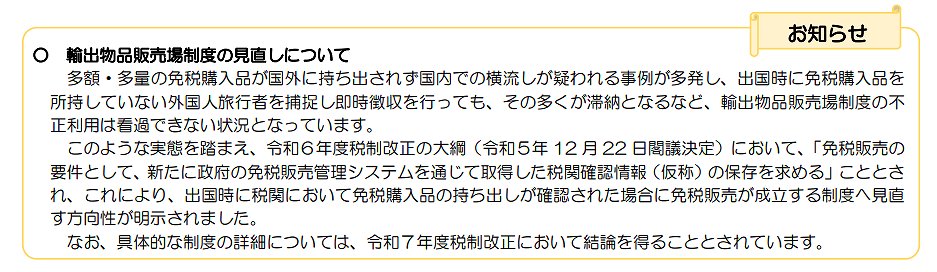 このような不正を踏まえ、2024年度(令和6年度)税制改正では、店舗での購入時ではなく、出国時に免税という形に変えようという方向性が示されました。