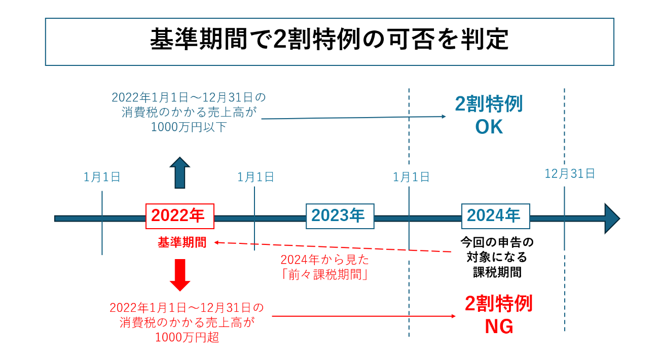 「今年の課税売上高1000万円を超えたから2割特例を使えない」と思っている方も多いようです。2割特例を使えるか使えないかを判定するのは、今年分ではありません。
