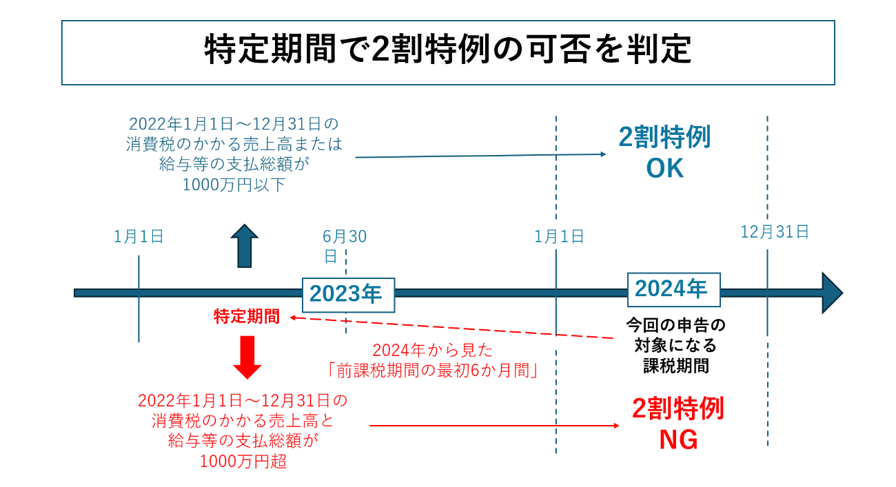 特定期間については、課税売上高だけでなく給与等の支払総額も判定基準に入ってくるので注意が必要です。ただ、フリーランスの場合、一人で活動していて給与等の支払総額は0円であることが多いかと思います。この場合、この6か月間の売上高が1000万円を超えても2割特例が使えることになります。
