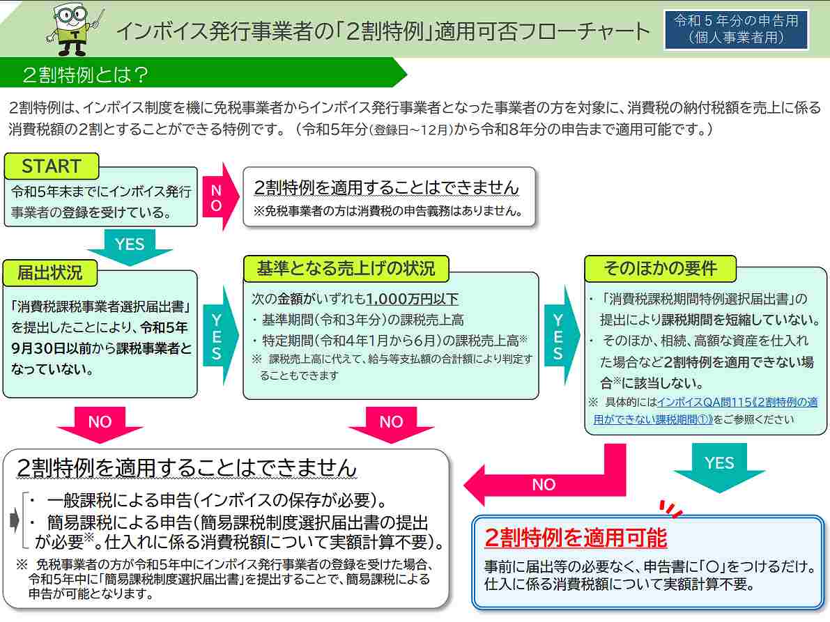 2割特例を使えるかどうかの判定は難しいものです。次のフローチャートを参考にするとよいかもしれません。