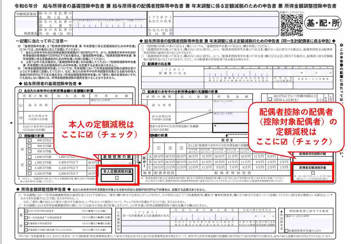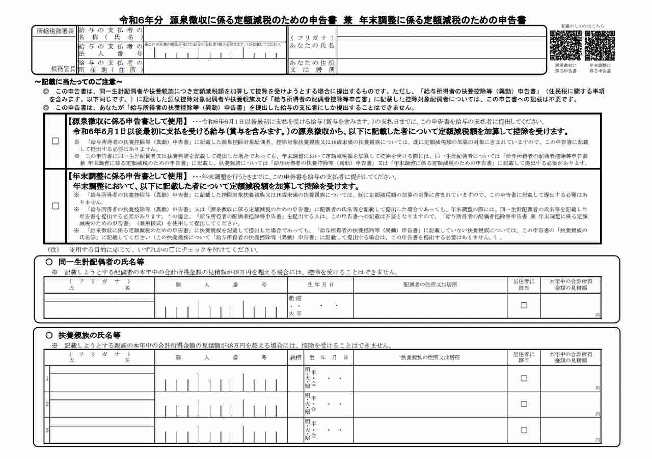 | 令和6年分 給与所得者の基礎控除申告書 兼 給与所得者の配偶者控除等申告書 兼 年末調整に係る定額減税のための申告書 兼 所得金額調整控除申告書 | 基礎控除・配偶者(特別控除)・定額減税・所得金額調整控除を受ける人 | 基礎控除 配偶者(特別)控除 所得金額調整控除 定額減税(本人分・控除対象配偶者分) |