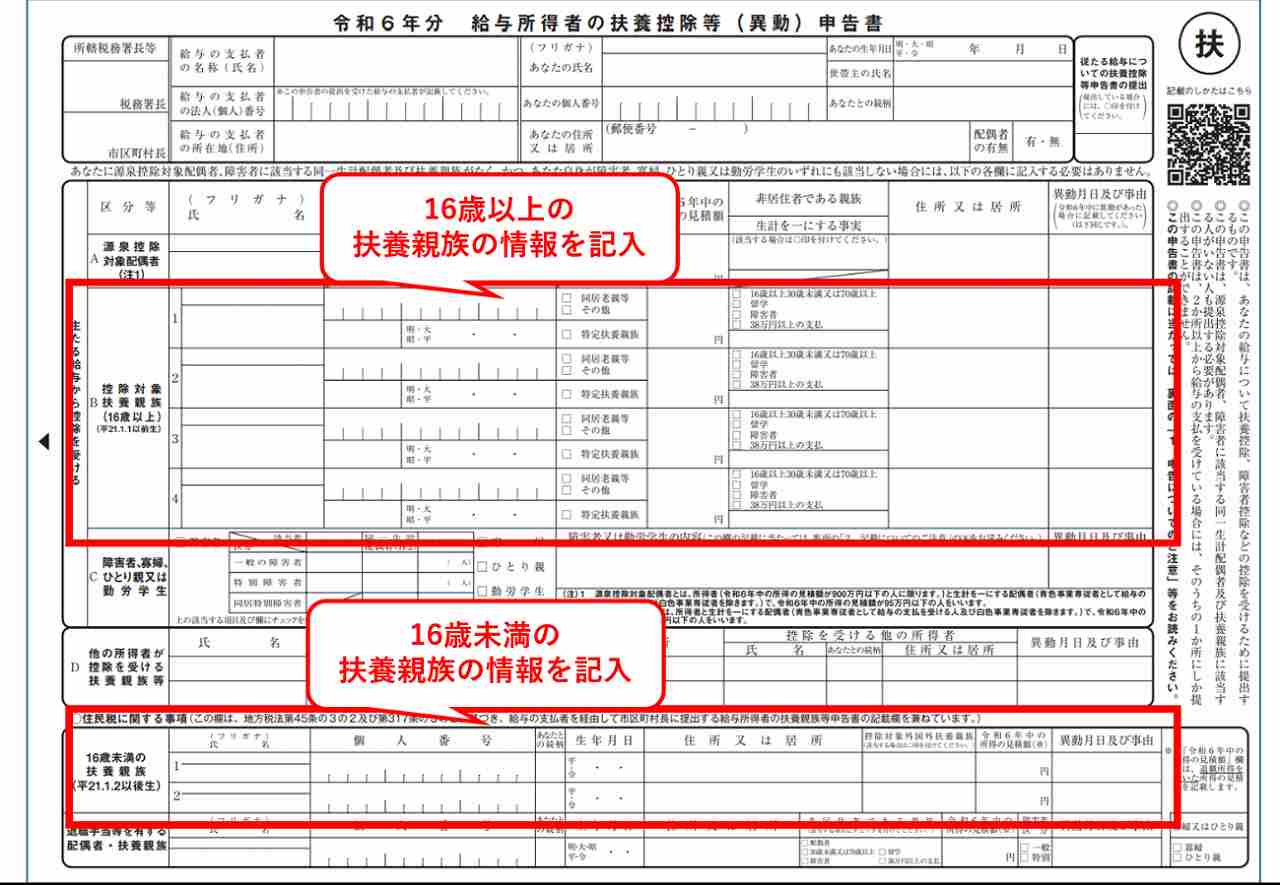 1は、令和6年の扶養控除等(異動)申告書の控除対象扶養親族欄や住民税「16歳未満の扶養親族」欄で書くとされています。2は、上記の年末調整の書類だけでは対応できません。