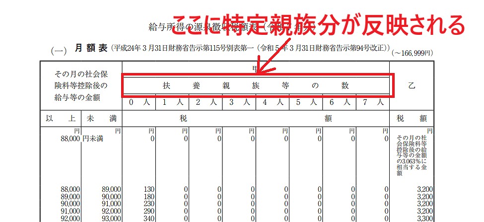 2の意味は「源泉徴収税額表(甲欄)の数字が2026年分から変わる」ということです。源泉徴収される所得税は「社会保険料控除後の支給額」と「扶養親族等の数」で決まります。この扶養親族等の数は2026年分から、特定親族特別控除も一部加味して判定することとなります。
