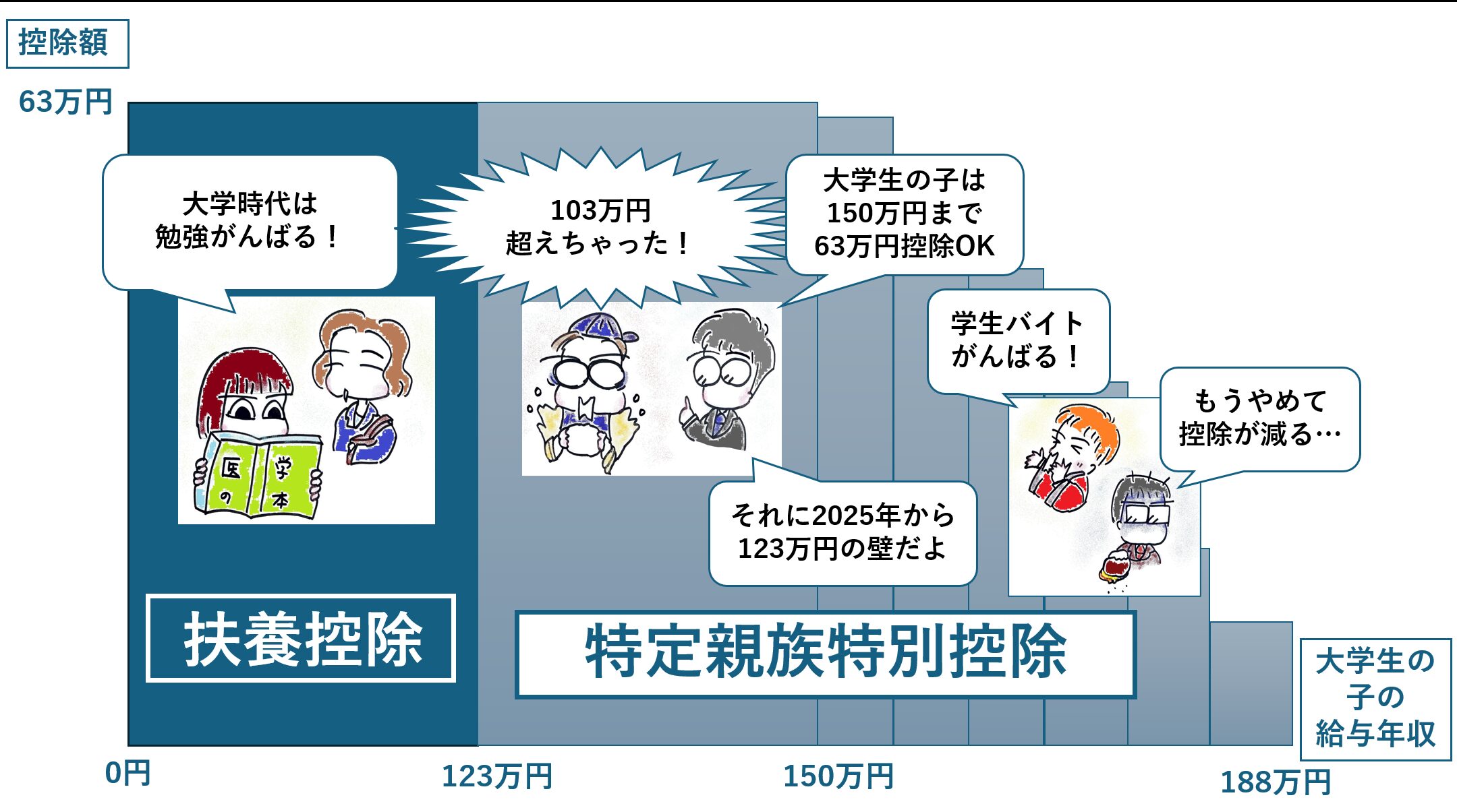 2025年以降、大学生の子が年123万円を超えてバイトで稼いでも年150万円までなら親は63万円を所得額から差し引けます。また、子が年150万円を超えて稼いでも、控除額がすぐに0円になるわけではありません。段階的に控除額が減っていくしくみとなっています。