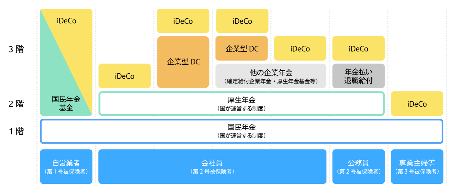確定拠出年金は、日本の年金制度の「3階建て」部分に位置づけられ、1階部分の「国民年金」 、2階部分の「厚生年金」 といった公的年金を補完する「私的年金」にあたります。