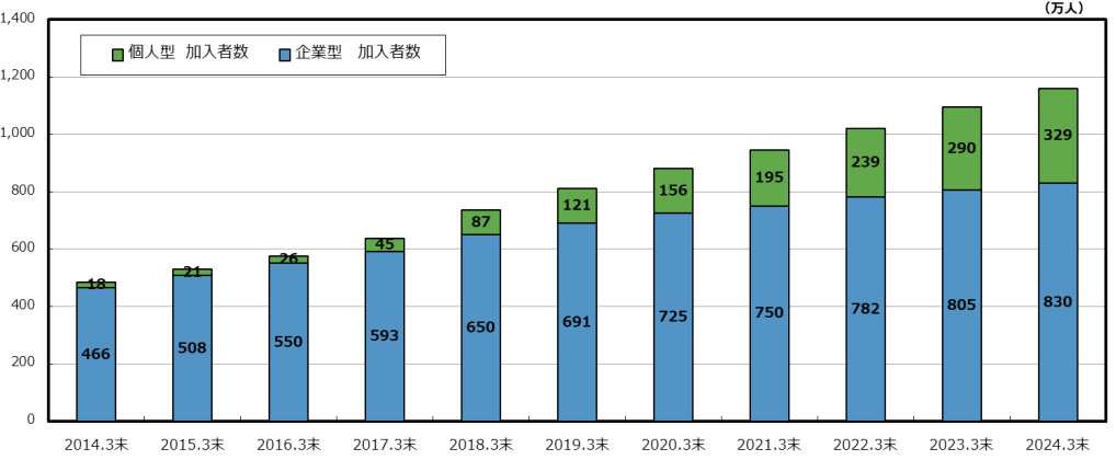 確定拠出年金の加入者数は年々増加の一途を辿っており、2024年3月末には個人型確定拠出年金(iDeCo)が約329万人、企業型が約830万人と、両制度合わせて1,159万人を超える規模に拡大しています。この顕著な増加は、多くの人々が老後資金の準備が喫緊の課題と捉えていることの表れと言えるでしょう。