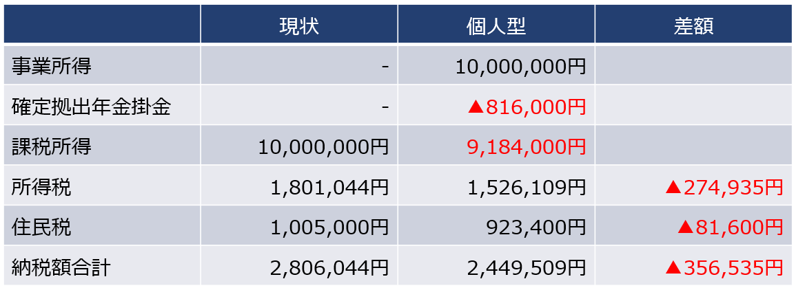 事業所得1,000万円の個人事業主が、iDeCoで月額上限の68,000円を積立(年間816,000円)した場合、年間356,535円もの所得税・住民税が軽減されます。