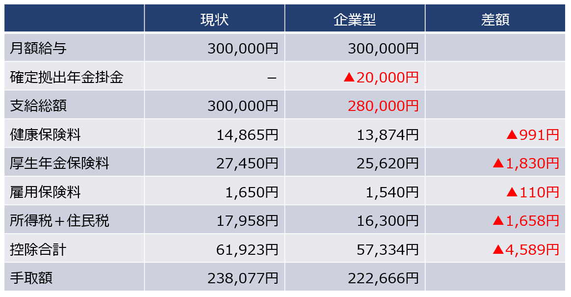 月額給与30万円(扶養なし・30歳)の社員が、企業型DCで月額20,000円を積立した場合、年間約55,068円(月額4,589円×12ヶ月)の社会保険料と税金が軽減されます。