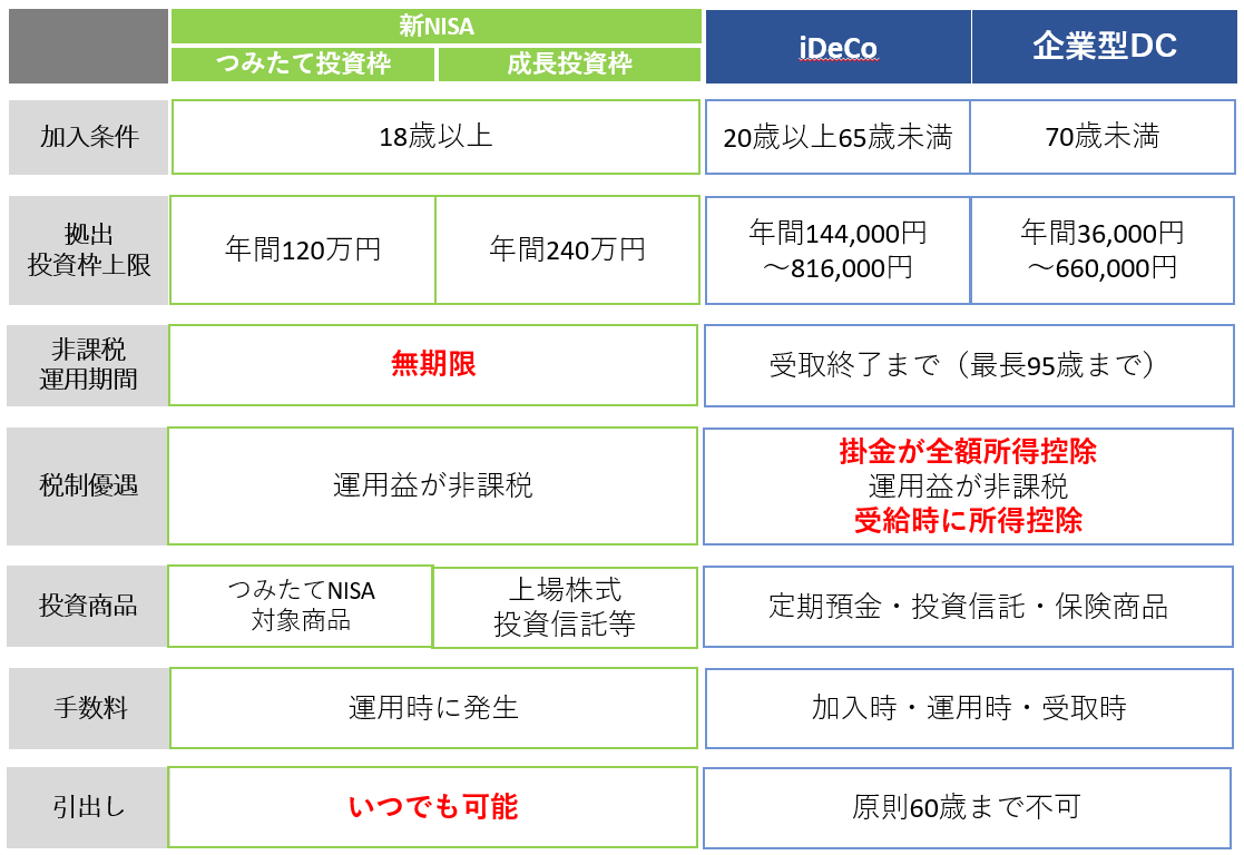 2024年から始まった新NISAも非課税で投資ができる制度として注目されています。確定拠出年金と新NISAはどちらも老後資金形成に有効ですが、それぞれ異なる特徴があります。