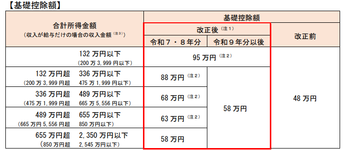 1つ目は「基礎控除の引き上げ」です。これまで基礎控除の最大の金額は48万円でした。しかし2025年分から58万円に引きあがります。