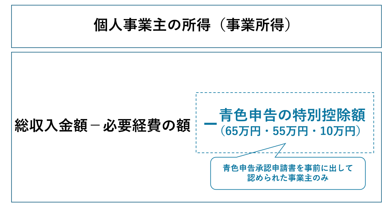 ただし、青色申告をしているなら事業所得から65万円・55万円・10万円いずれかの金額を差し引いた額が所得額となります。なお、雑所得は青色申告ができません。