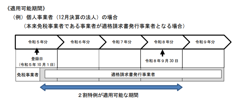 2割特例については「2023年10月1日の属する課税期間から2023年10月1日から3年を経過する日の属する課税期間まで」適用、となっています。個人事業主ならば「2023年10月1日から12月31日までの期間と2024年(令和6年)・2025年(令和7年)・2026年(令和8年)」です。