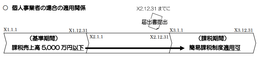 簡易課税制度選択届出書の提出期限は、対象となる課税期間が始まる日の前日です。個人事業主ならば、次のようになります。