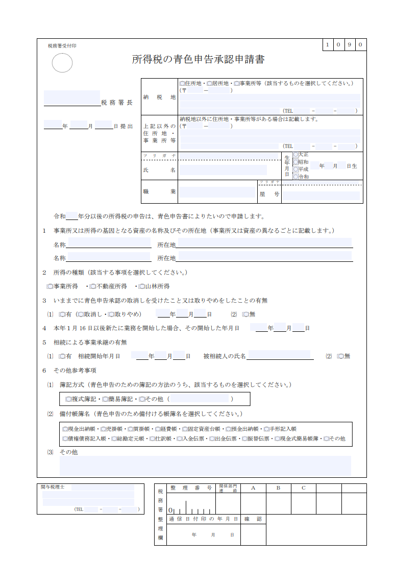 青色申告を行う前に「青色申告の承認申請書」を提出する必要があります。書面は次のようなものです。