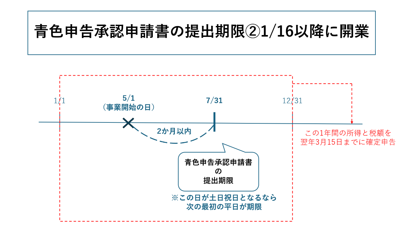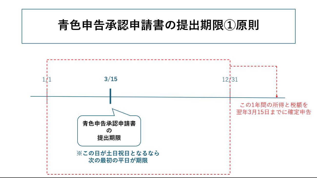 個人事業主の誤解が多いのが「青色申告承認申請書の提出期限」です。「年明け、確定申告書と一緒に出せばいい」と思い込んでいる方が多いのですが、実際の期限は次のようになっています。