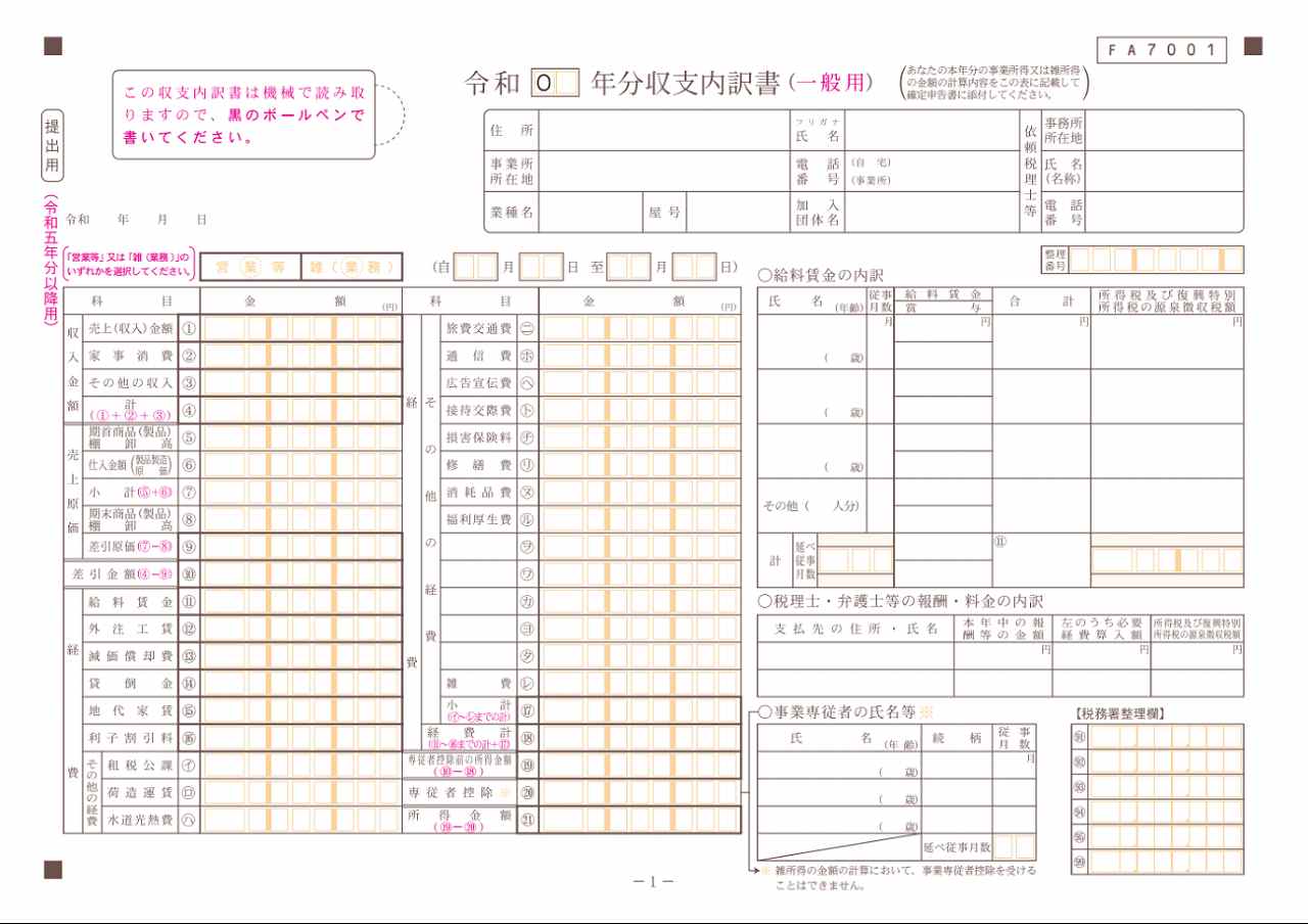 白色申告では、収支内訳書を使います。この用紙は次のようになっています。