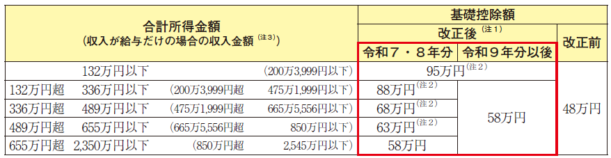 基礎控除額は、合計所得金額が2,350万円以下(給与収入のみの場合は、2,545万円以下)の場合、改正前は48万円でした。そして、令和7年度税制改正によって、次の表のとおり合計所得金額に応じて最大95万円に増えました。