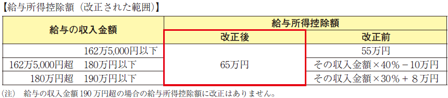 給与の収入金額が190万円以下の方について、給与所得控除が変更されました。具体的には、給与所得控除の下限額が、55万円から65万円に引上げられました。