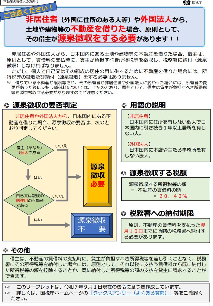 インバウンドが進んだ昨今、賃借人が家賃とは別に、所得税を払わざるを得ないケースが増えているようです。国税庁からも注意を促すようなお知らせが出ています。