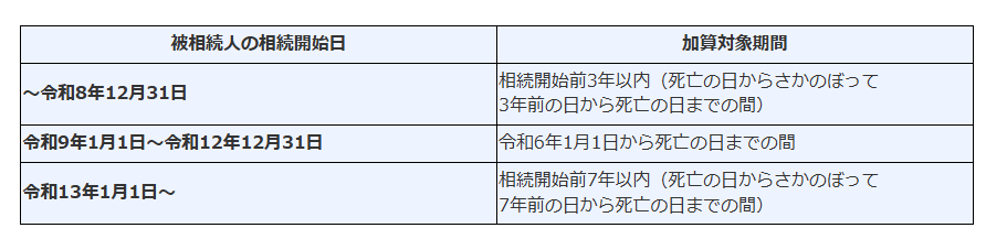 加算対象期間とは、相続税の課税価格に加算される暦年贈与の対象期間をいいます。令和6年1月1日以後の暦年課税に係る贈与により取得した財産については、その加算対象期間が相続開始前7年以内とされます。具体的な被相続人の相続開始日(基本的には被相続人の死亡日)に応じた加算対象期間は、次の表のとおりです。