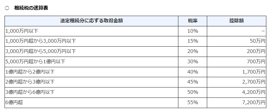 なお、税率や控除額は、法定相続分に応じた取得金額によって下記のとおりです。