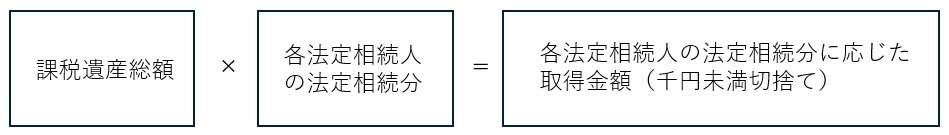 ③ 上記②で計算した課税遺産総額を、各法定相続人が民法に定める法定相続分に従って取得したものと仮定して、各法定相続人の法定相続分に応じた取得金額を計算します。
