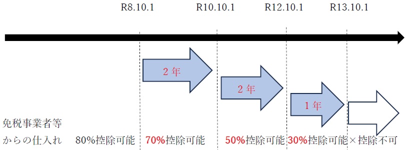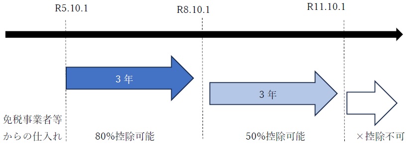 具体的には、インボイス制度が始まる令和5年10月1日から3年間は免税事業者等からの課税仕入れについて80%相当は控除を可能とし、令和8年10月1日からの3年間は50%相当は控除可能とし、令和11年10月1日からは経過措置は完全に終了し、免税事業者等からの課税仕入れについて、控除は「ゼロ」とする内容です。