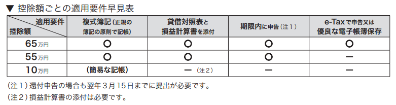 青色申告特別控除には65万円・55万円・10万円の3つがあります。それぞれ次のようになっています。