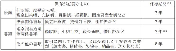記帳した帳簿などの保管も必要です。各帳簿についての保管期間は次のようになっています。