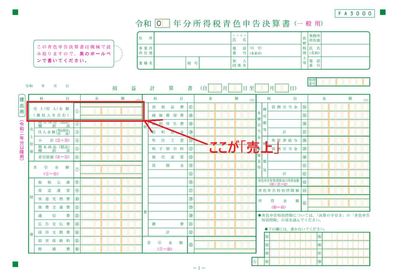 売上とは、事業主の本業である商品やサービスを販売したことにより得られる収入の総額です。損益計算書の下記部分に表示されます。