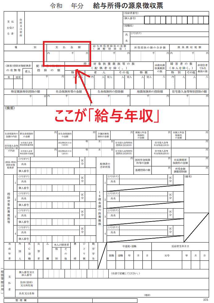 年収は、主にサラリーマンやバイト・パートなどの給与に用いられる言葉です。給与や賞与などでもらった金額の1年間の合計額を言います。給与所得の源泉徴収票の左上にある「支払総額」欄が給与年収の額を表します。