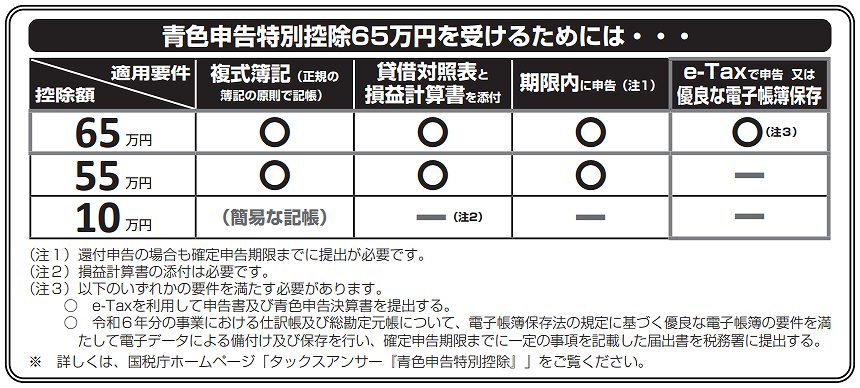 特別控除とは青色申告ならではの特典です。10万円・55万円・65万円があります。どれが適用されるかは、条件によって変わります。次の通りです。