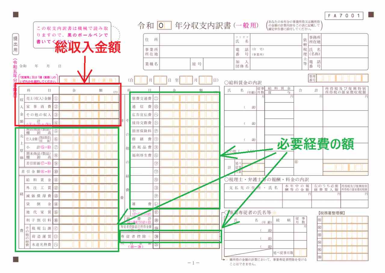 「総所得金額」「必要経費の額」は、白色申告で提出する場合、収支内訳書の次の部分となります。