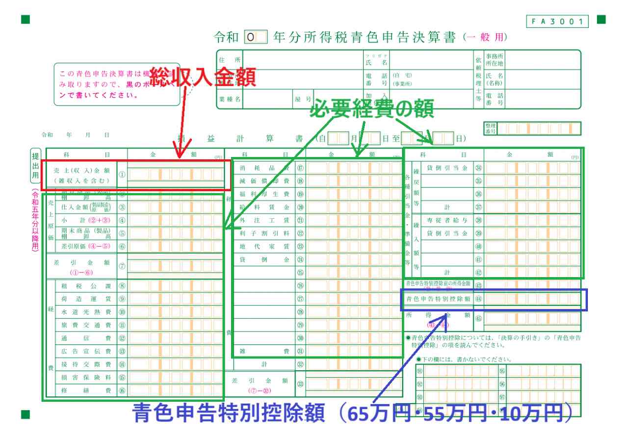 先ほどの「総収入金額-必要経費の額=事業所得の額」は白色申告の話です。青色申告だと、次の式で事業所得の額を計算します。