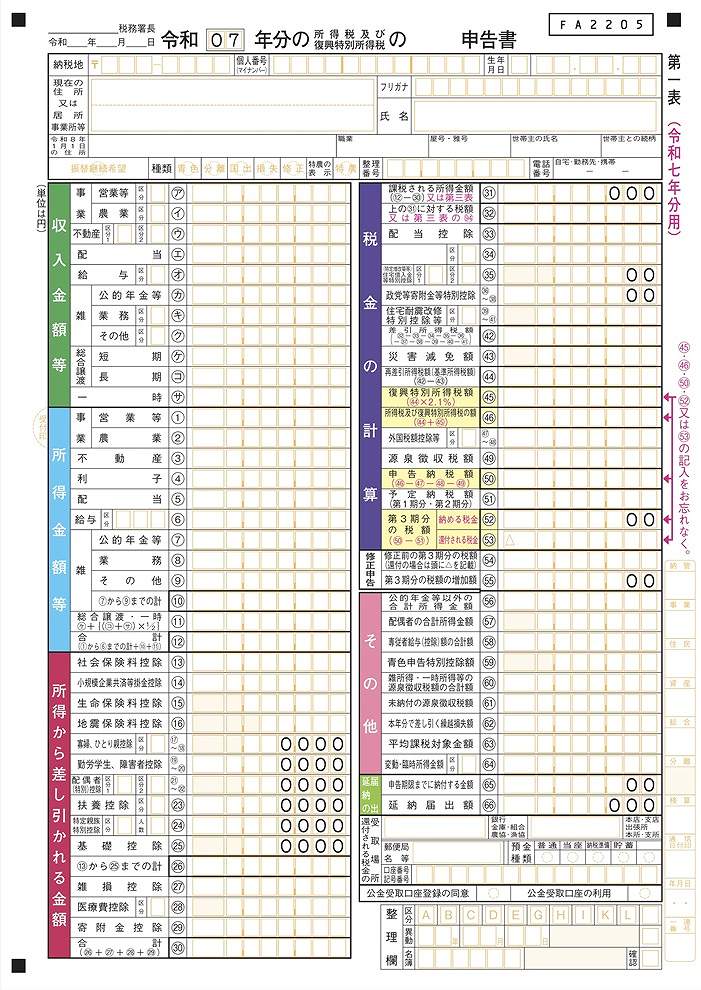 申告書第一表・第二表は、所得額や控除額、納付税額を記入する書類です。青色申告決算書などの添付書類の内容に基づいて記載します。