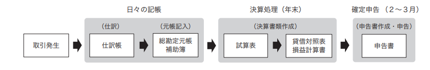 55万円・65万円の特別控除を受けるには、正規の簿記の原則(一般的には複式簿記)に基づいて記帳し、貸借対照表と損益計算書を作成しなくてはなりません。複式簿記のプロセスは次の通りです。