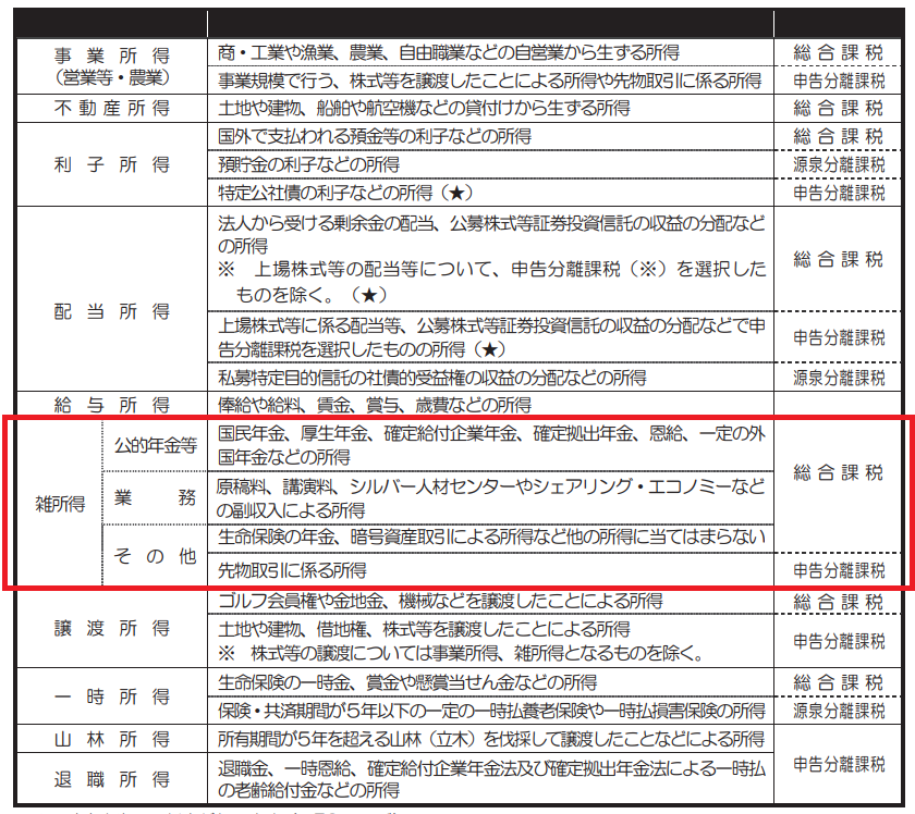 この中で、他の所得のどれにも当てはまらない所得(赤枠部分)が「雑所得」に分類されます。つまり、他の所得区分の要件を満たさない「その他」の所得がすべてここに含まれるのです。
