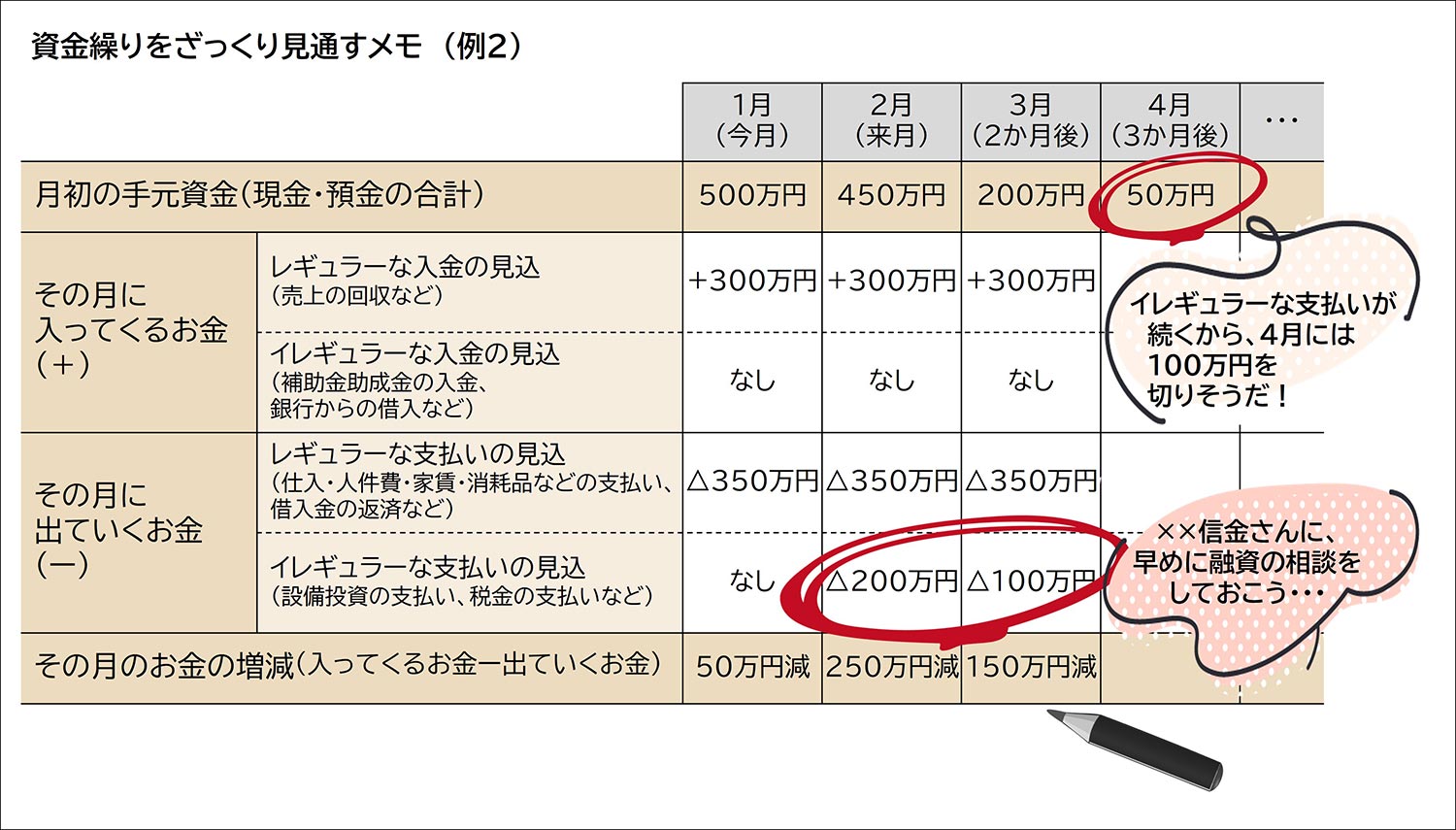 レギュラーな収支のバランスは毎月50万円のマイナスです。入金を増やすか支払いを減らすかお金を足すかしなければなりませんが、手元資金が500万円あるので、経営者は「半年以内くらいに手を打てば大丈夫だろう」とのんびり構えている状態だとします。しかし来月と再来月に大きめの支払い予定があることを思い出しました。そこで上図のメモのように整理してみると、思ったより早く、4月には資金がかなりひっ迫することがと分かりました。思っていたより早く手を打たなければなりません。日ごろからこのような見通しをつけていれば、そのことに気づくことができます。